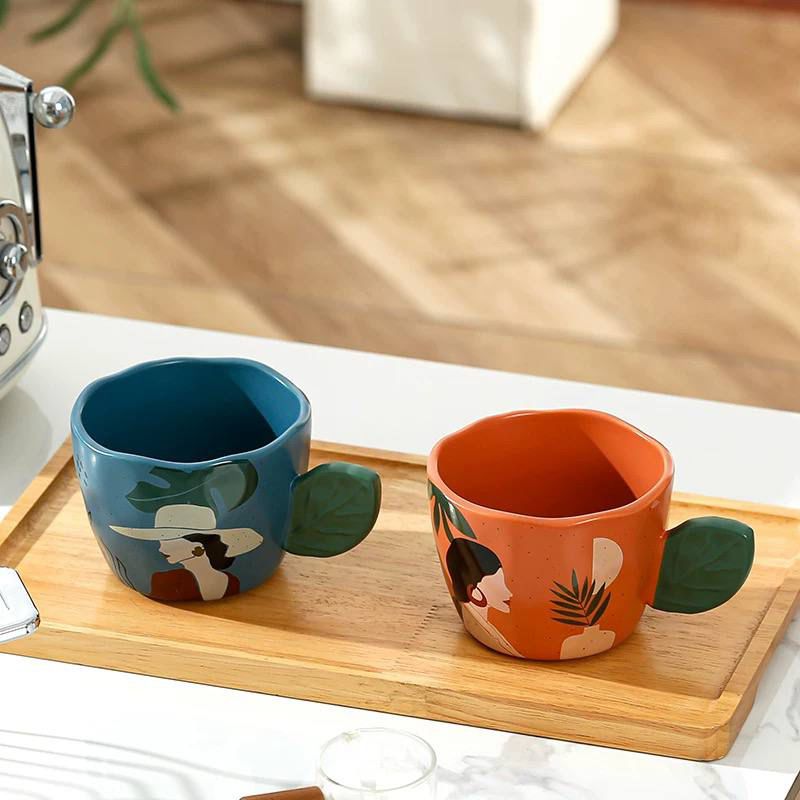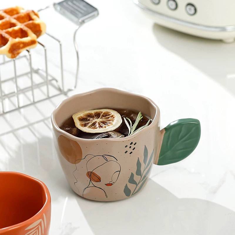 مج سيراميك بتصميم فني تجريدي بيد ورقة شجر